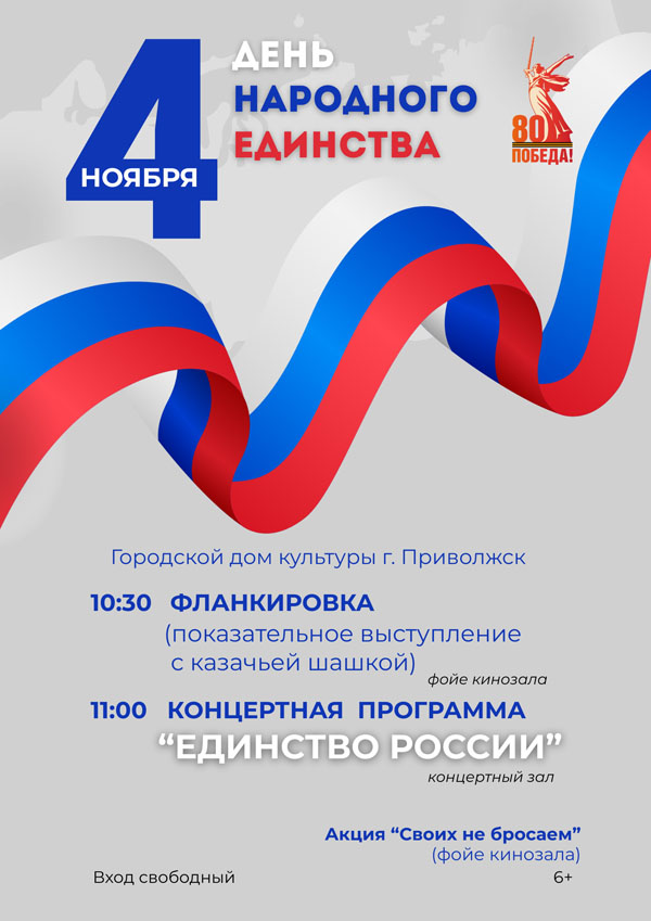 В 11:00 начнётся праздничный концерт «Единство России», в котором примут участие творческие коллективы и военно-патриотические клубы Приволжского района. Образцовый хореографический коллектив «Колибри» и заслуженный коллектив народного творчества «Фаина» выступят с танцевальными номерами, Роман Волков и народный ансамбль «Гармония» посвятят вокальные композиции Родине, любви к стране, её необъятным просторам, патриотические клубы «Витязь», «Юный десантник» и «Патриот» объединятся в показательных выступлениях. Вход свободный (6+).