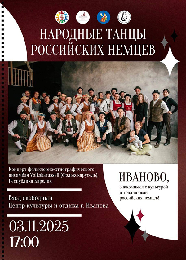 Уникальный коллектив российских немцев впервые представит своё искусство жителям Иваново в рамках юбилейных гастролей. Этнографический ансамбль «Volkskarussell» («Фольклорная карусель»), удостоенный звания «Народный коллектив самодеятельного художественного творчества Республики Карелия», приглашает всех на незабываемый концерт.