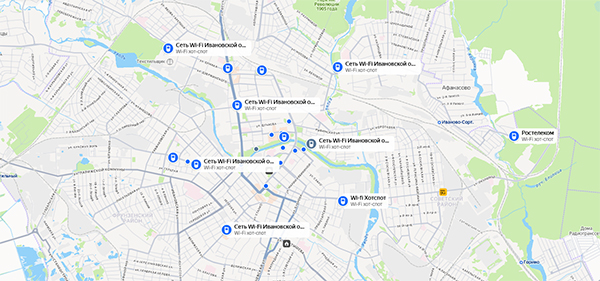 Добавим, на карту нанесены как новые точки бесплатной общедоступной сети «Ivanovo_WiFi_Free», открытые в рамках регионального проекта, так и точки доступа организаций–партнеров проекта, а также ранее действовавшие точки доступа, например, в заведениях общепита, для которых нужен пароль.