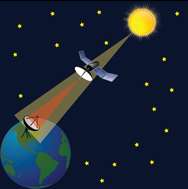 «Солнечное вещание» на одной линии со спутником связи и принимающей земной станцией может перебить телесигнал. Суть явления проще всего представить через аналогию: если позади свечи включить прожектор, свеча станет незаметна в потоке света. Расположение Солнца на прямой линии со спутником связи и земной приемной станцией длится несколько минут, затем благодаря вращению Земли вокруг своей оси спутник связи уходит из под «солнечной засветки».